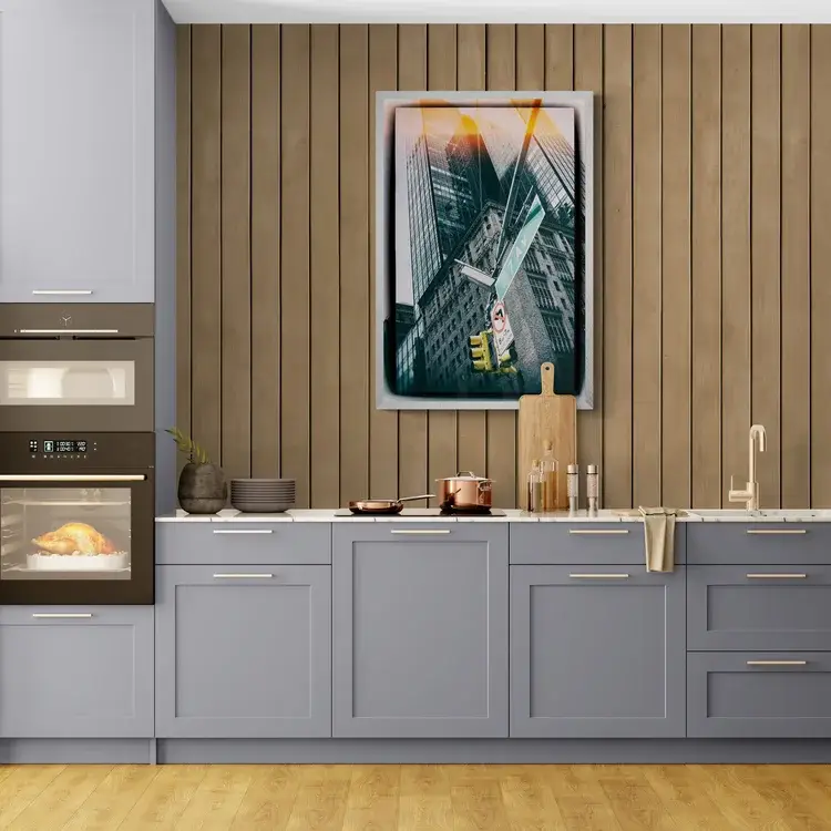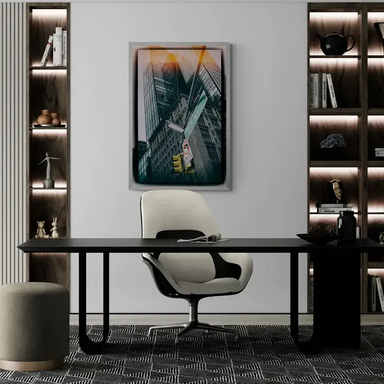 - A home office with a wooden desk, a metal chair, and a green plant. The art would create a sense of height and inspiration for the work environment.