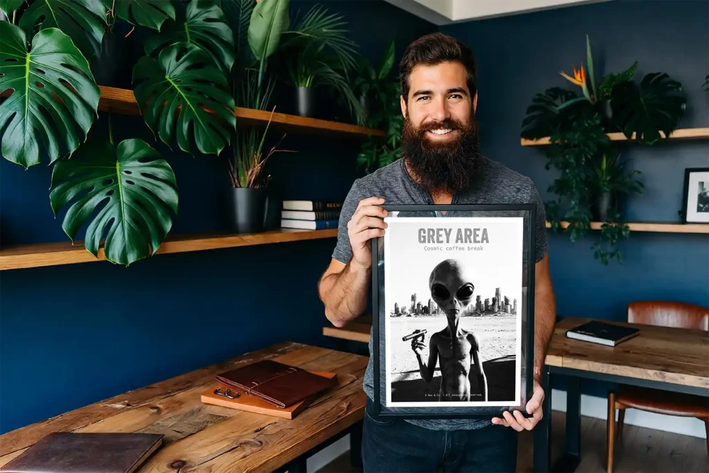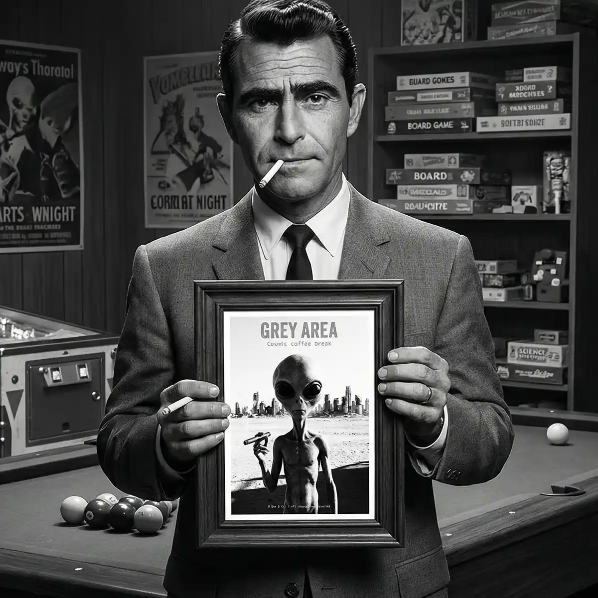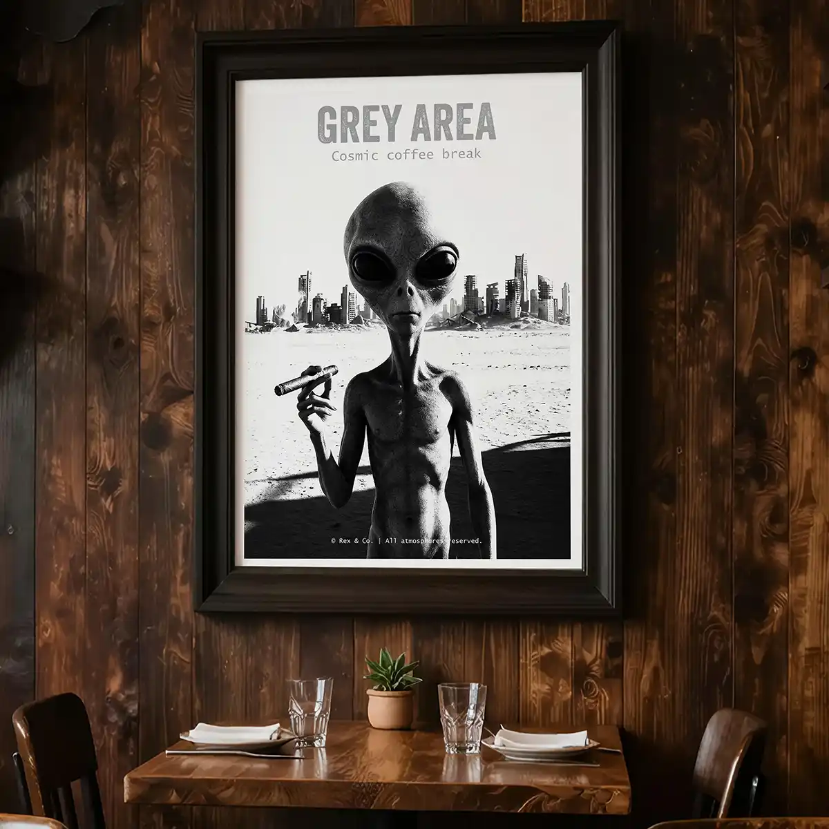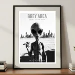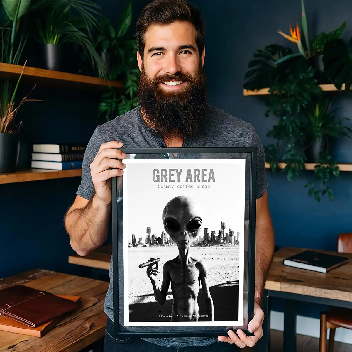 You are witnessing a universal constant: the profound calm after the hard work is done. “GREY AREA” is a monumental piece of sci-fi noir that finds dry wit and stark beauty in the aftermath. This breathtaking digital art print depicts a classic Grey Alien enjoying a cigar in a vast desert, the silhouettes of a destroyed city stretching behind him. It’s a masterful clash of iconic imagery, existential scale, and the signature Rex & Co. wit, captured in exquisite black and white.