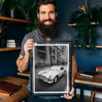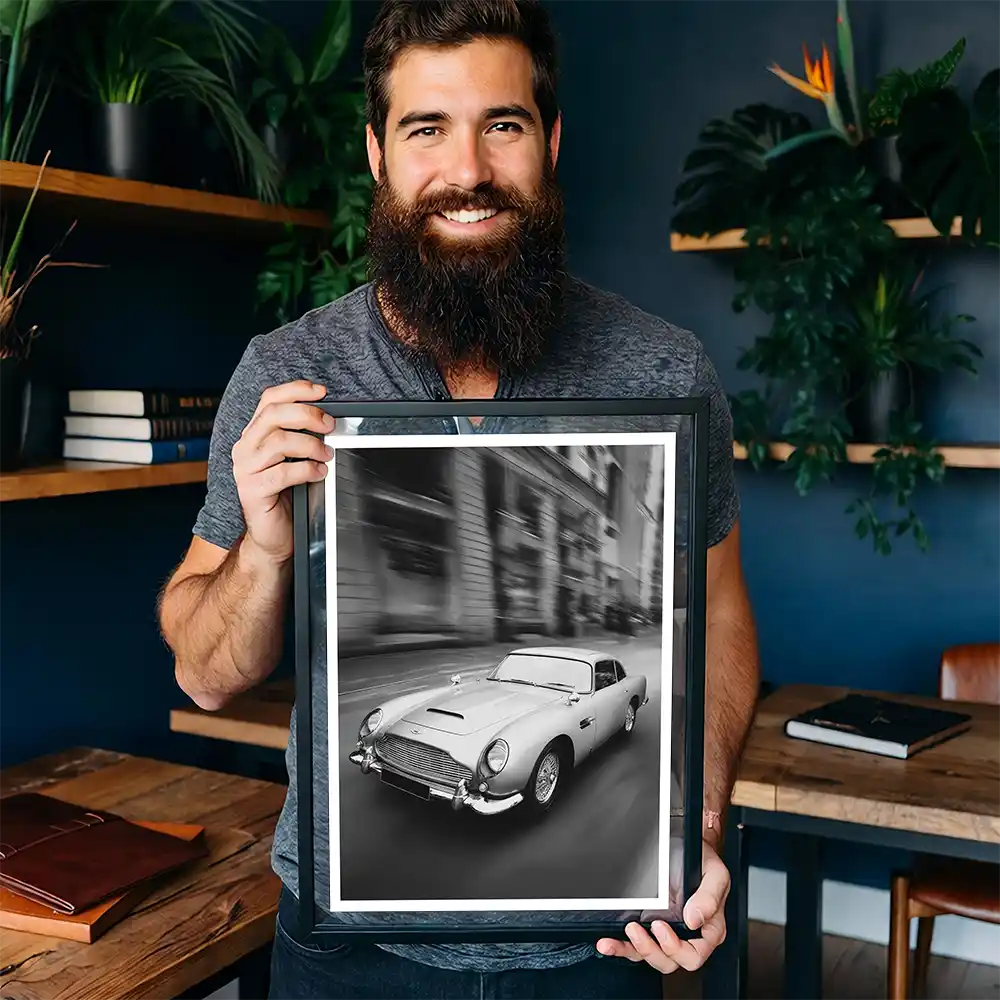 Elevate your space with this stunning black and white classic car poster. This Aston Martin retro art print is a digital illustration/photo fusion features the iconic Aston Martin DB5—the legendary car from James Bond’s Goldfinger. This high-quality printable artwork by Rex & Co. blends sleek modern aesthetics with timeless retro charm, making it a must-have for 007 fans, car enthusiasts, and lovers of cool, minimalist art.