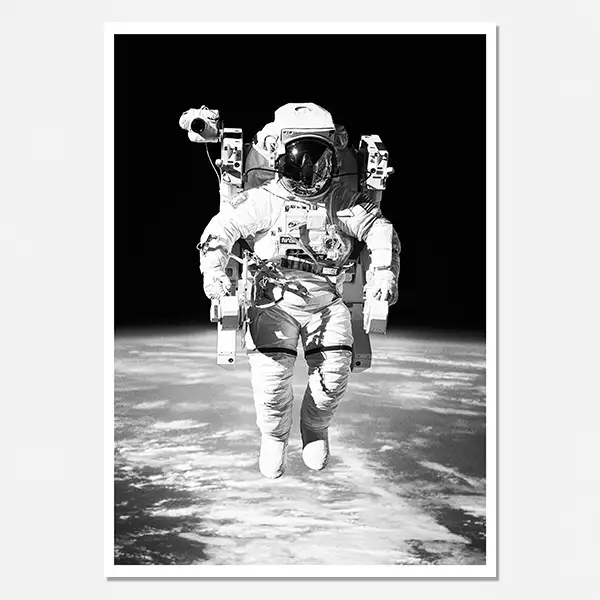 Blast off into style with this cool black and white astronaut poster by Seeress. This digitally remastered and enhanced artwork features a lone astronaut floating in space above Earth, rendered with dramatic film noir effects for maximum visual impact. Perfect for: