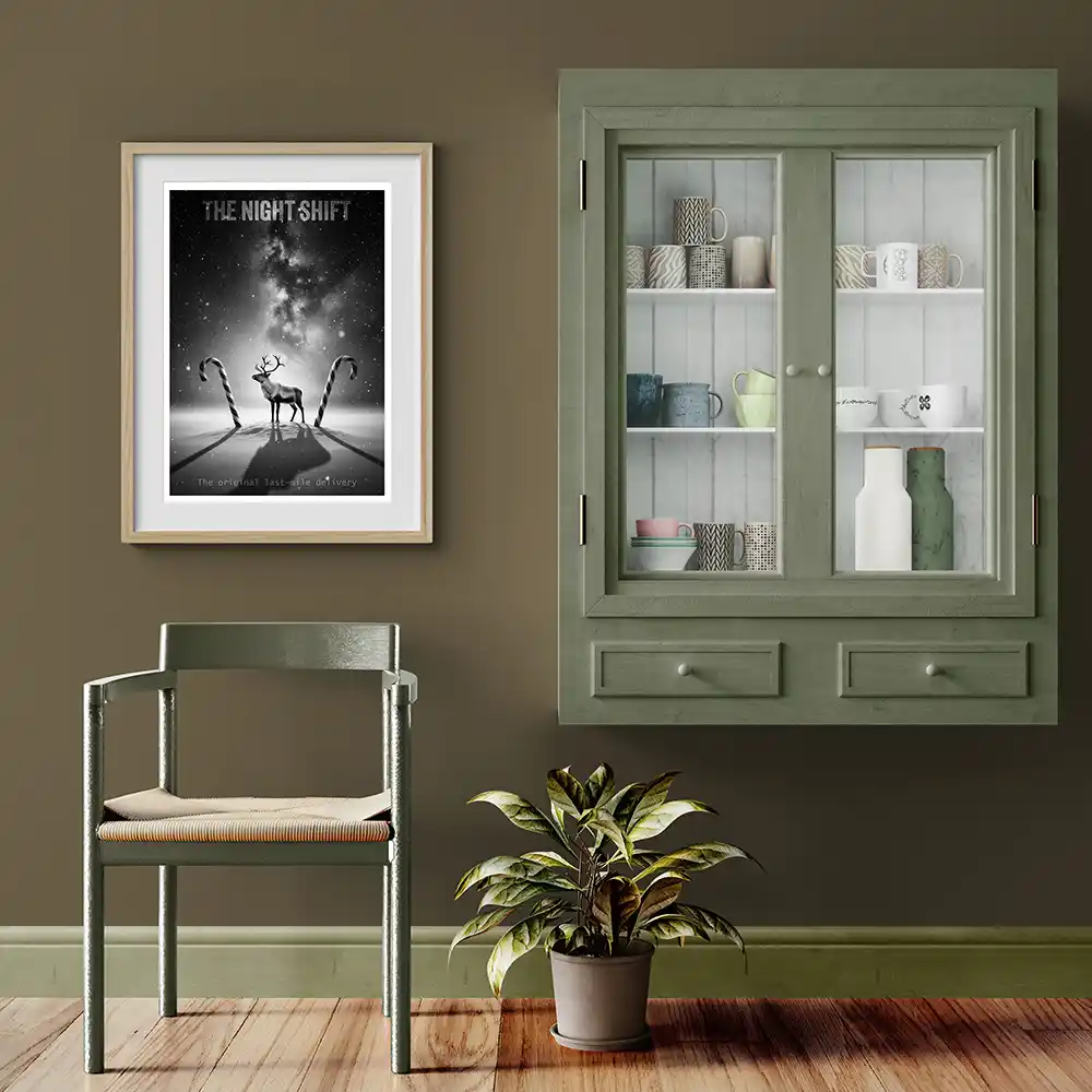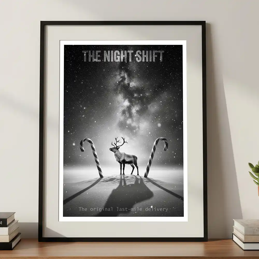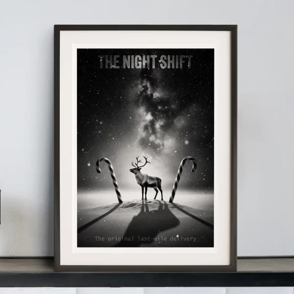 Meet the original master of the operation with ‘The Night Shift’. This digital art print from Rex & Co.’s ‘Nocturnal Myths’ collection strips away festive cliché to reveal the reindeer as a weary, professional operator—a blue-collar hero under an infinite starry sky. Rendered in stark, high-contrast black and white, this typography-driven piece captures the grit and timeless duty of the holiday’s most essential worker. It is expertly designed as the perfect companion to ‘The Overseer’ Santa print, creating a powerful, narrative-driven diptych for your gallery wall.