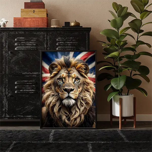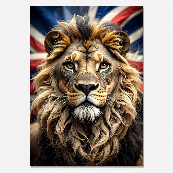 Command attention with this set of 3 cool AI-generated British lion portraits by digital artist Michael Paul Bennett. These striking artworks feature majestic lions superimposed over the iconic Union Jack flag, blending wildlife grandeur with patriotic symbolism in a contemporary digital art style.