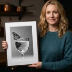 Explore the beautiful transience of a moment with this masterclass in minimalist visual philosophy. This digital art print captures a solitary butterfly perched on the rim of a wine glass, its perfect reflection descending into the void below. More than a simple still life, it is a clean, balanced composition that becomes a profound meditation on presence, illusion, and the delicate nature of beauty. Rendered in pristine, clinical black and white with refined elegance, it is both deeply calming and intellectually stimulating—a modern vanitas for the thoughtful home.