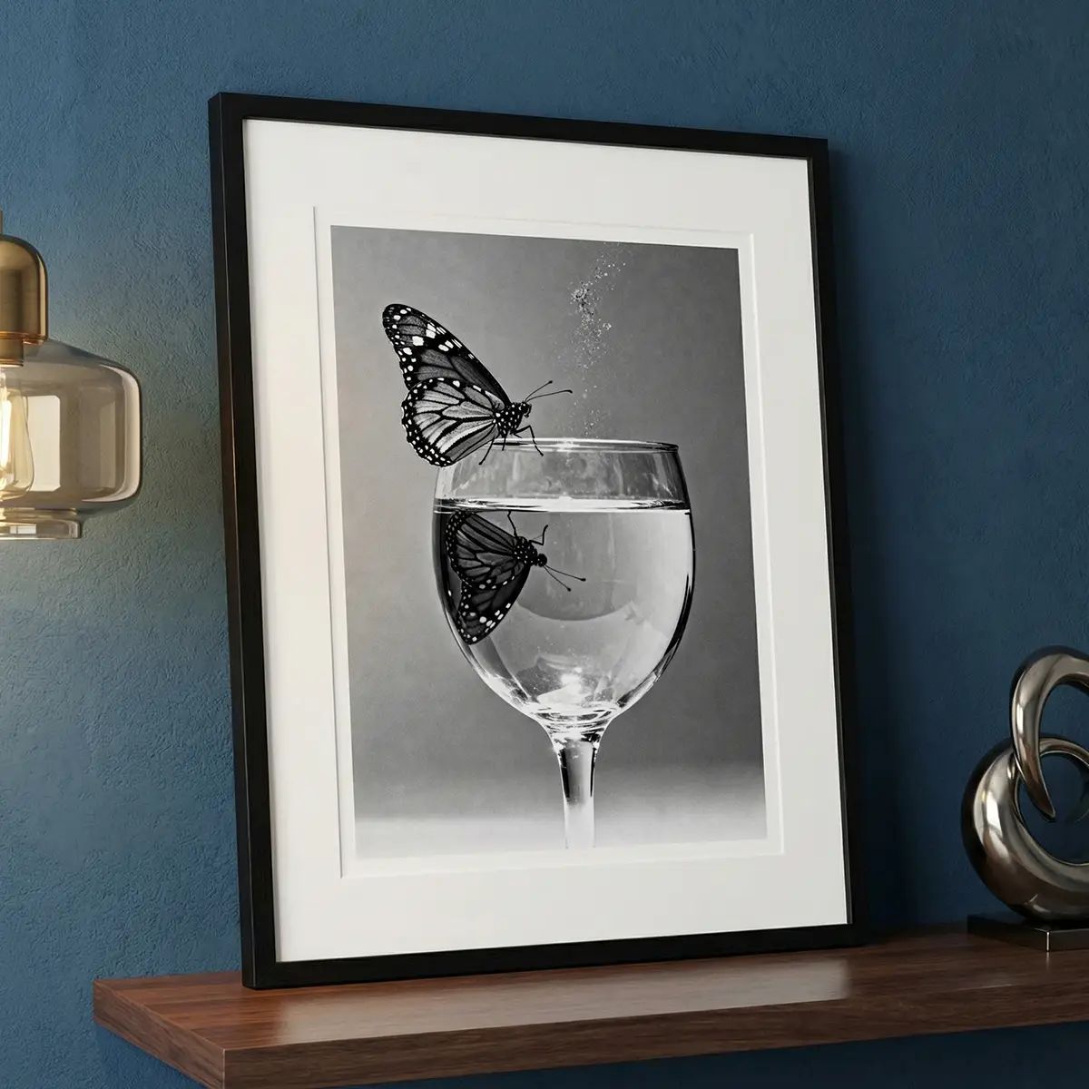 Your purchase unlocks immediate access to a premium, high-resolution JPEG file. This is sustainable, on-demand art—print it on fine art paper with a high-gloss or pearl finish to enhance the dramatic contrast and the illusion of the reflection. The high DPI ensures every delicate detail of the butterfly and the crisp edge of the glass are captured with perfect clarity.c.