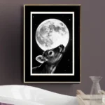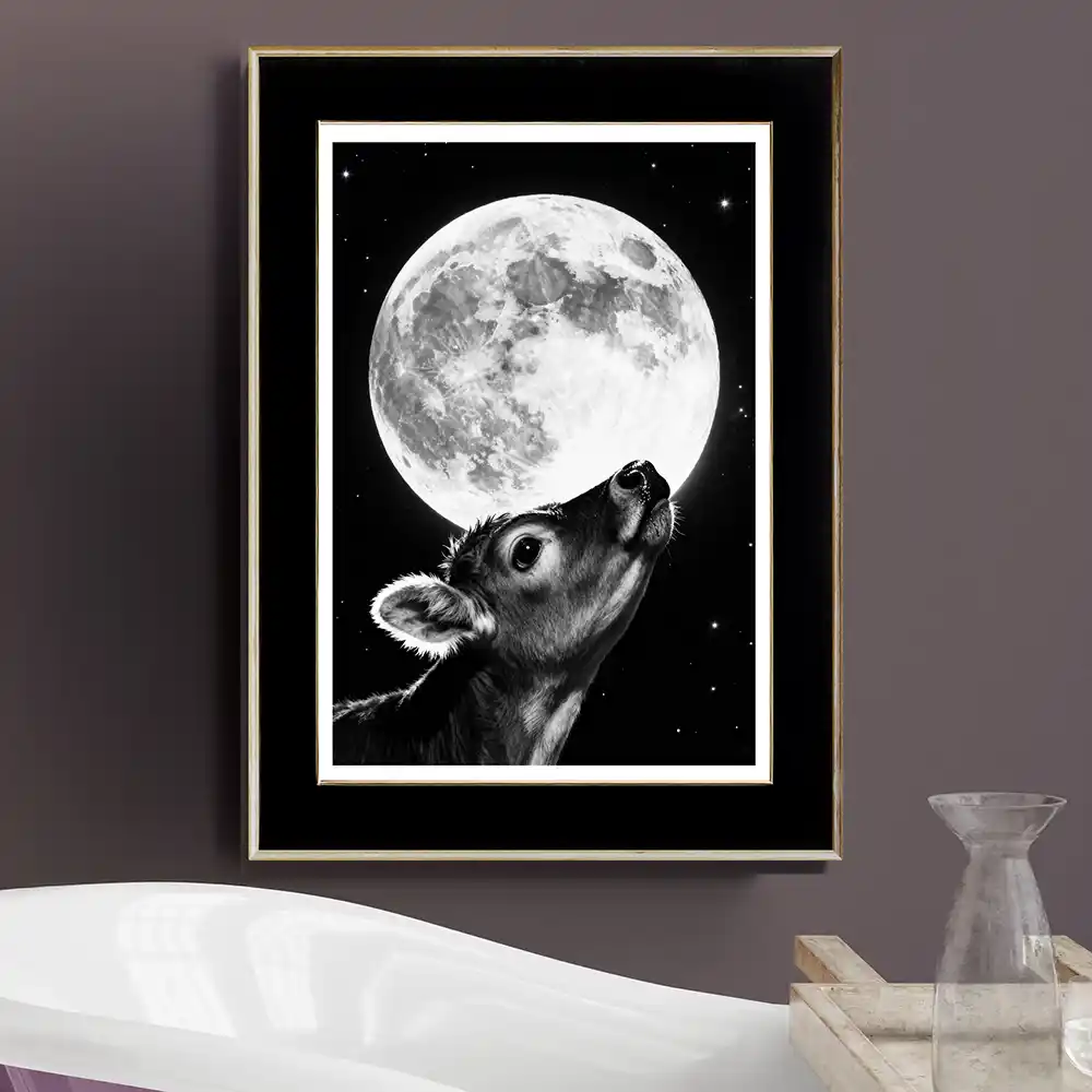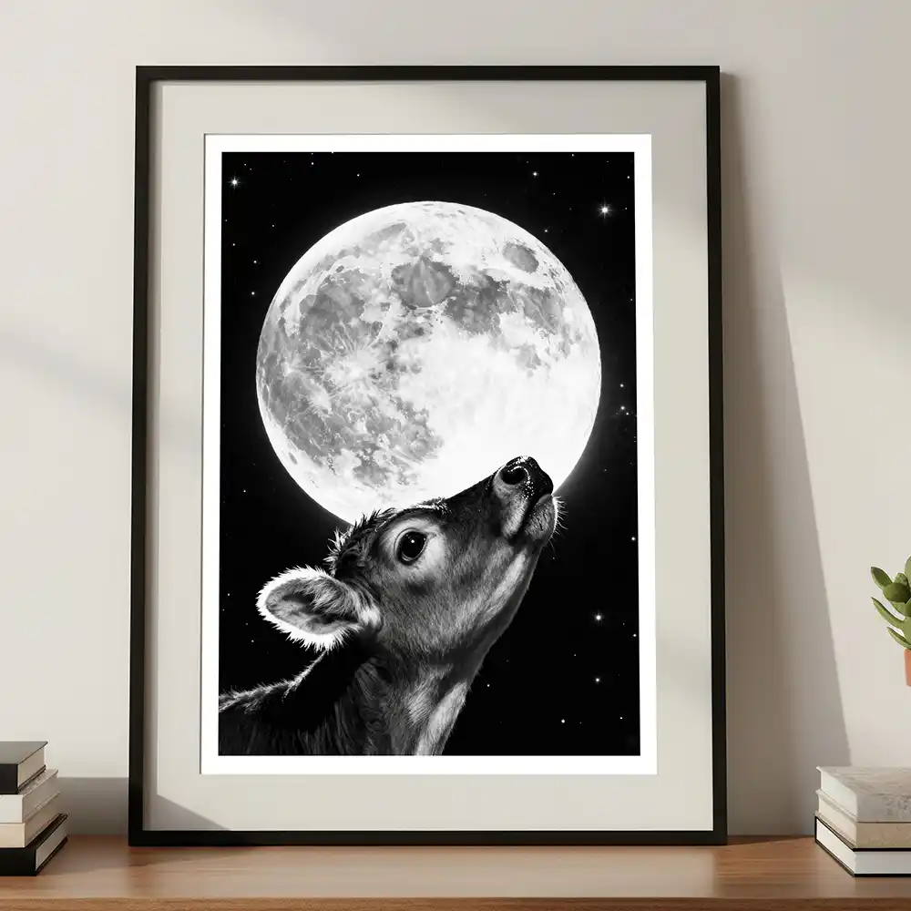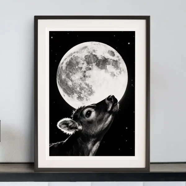 Capture a moment of pure, silent wonder with this poetic digital art print. It depicts a tender, minimalist scene where a young calf tilts its head in a quiet conference with a vast, cratered moon. More than an animal portrait, it’s a modern myth about innocence’s first encounter with cosmic awe. Sculpted in sublime black and white with deep contrast, the piece is designed to inspire calm and contemplation, creating a peaceful sanctuary on your wall that captures the quiet dialogue between earth and the cosmos.
