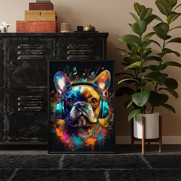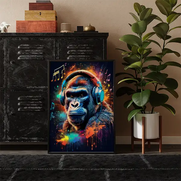 Elevate your space with this striking set of 2 printable AI art posters by Michael Paul Bennett, featuring a French Bulldog and a Gorilla jamming out in headphones against a sleek black background. Bursting with vibrant color splashes and music notes, these high-energy prints are perfect for music lovers, urban decorators, and fans of edgy, modern art.