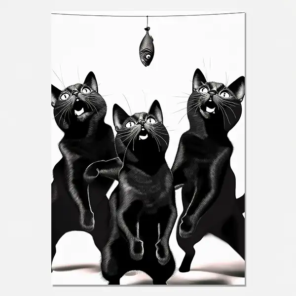 Add a playful touch to your space with this funny digital illustration of three mischievous black cats desperately reaching for a dangling fish! This instant-download printable artwork is perfect for cat lovers, humor enthusiasts, and anyone who adores quirky, sustainable wall decor.