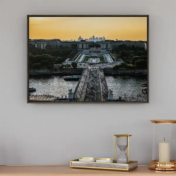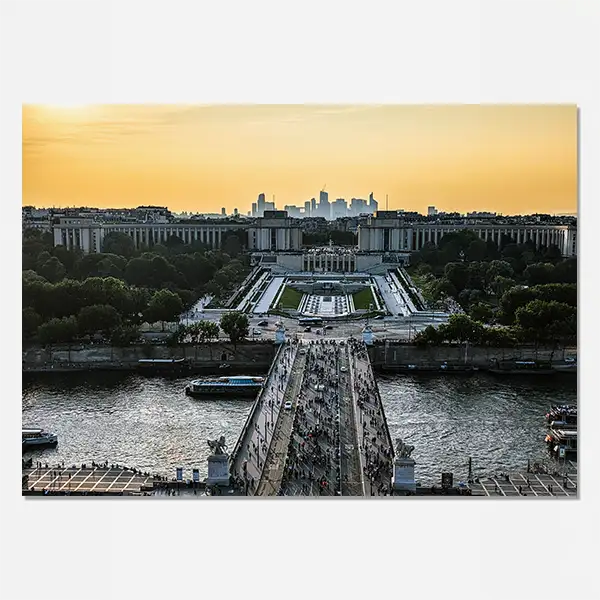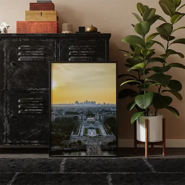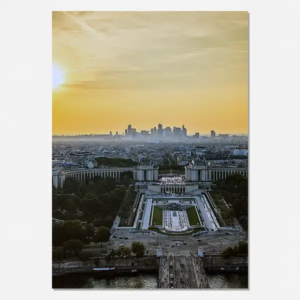 Bask in the magic of Paris’ golden hour with this set of 2 printable artworks captured from the Eiffel Tower, showcasing the city’s radiant transformation at dusk. Photographed by Seeress, this pair features a La Défense Sunset with Modern skyscrapers protruding through a fiery sky.