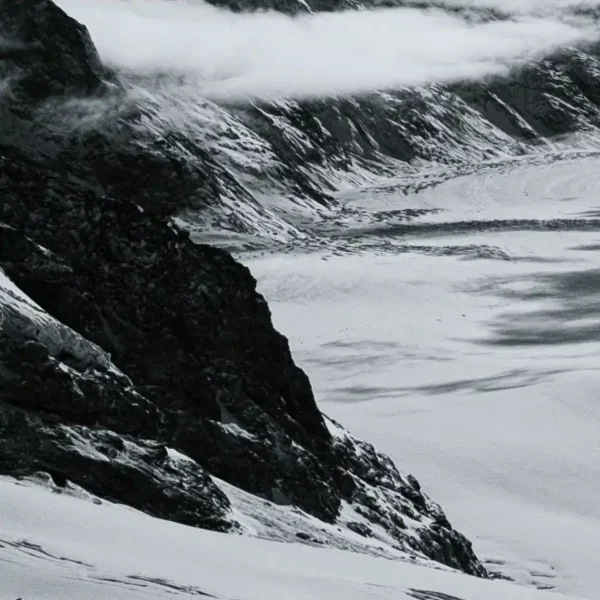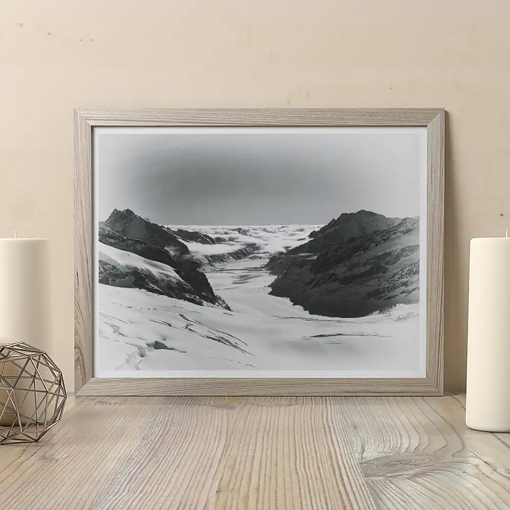 This is more than a photograph; it is a moment of sublime atmospheric connection. Captured from the Jungfraujoch plateau by Mark Marsh, this piece looks down upon the ancient Guggi Glacier as epic cloud formations weave between the peaks like a celestial bridge. The ethereal monochrome processing enhances the dreamlike, quiet power of this high-altitude convergence.