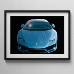 Rev up your space with this electrifying digitally enhanced Lamborghini Huracán print, where cutting-edge automotive design meets cyberpunk aesthetics. Created by digital artist and photographer Seeress, this cool art transforms the iconic supercar into a neon-drenched masterpiece with glowing accents, particle effects, and a sleek black background that makes the blue Huracán pop.