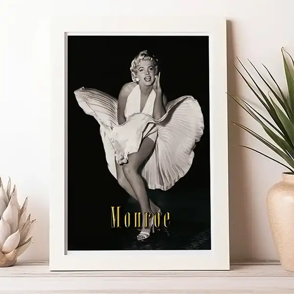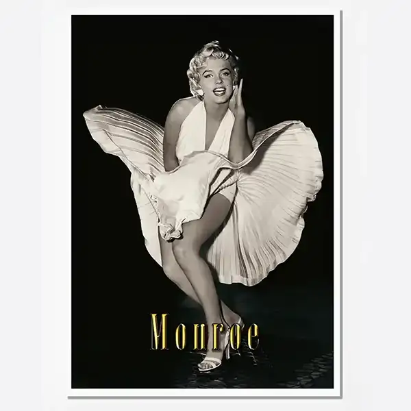 This stunning vintage art print captures Marilyn Monroe in an iconic pose, enhanced with sepia tones and a stunning texture to evoke a nostalgic, cinematic feel. The text “Monroe” is elegantly styled in a warm gold color, adding a touch of sophistication and class – it stands out beautifully against the textured background.