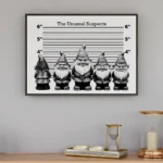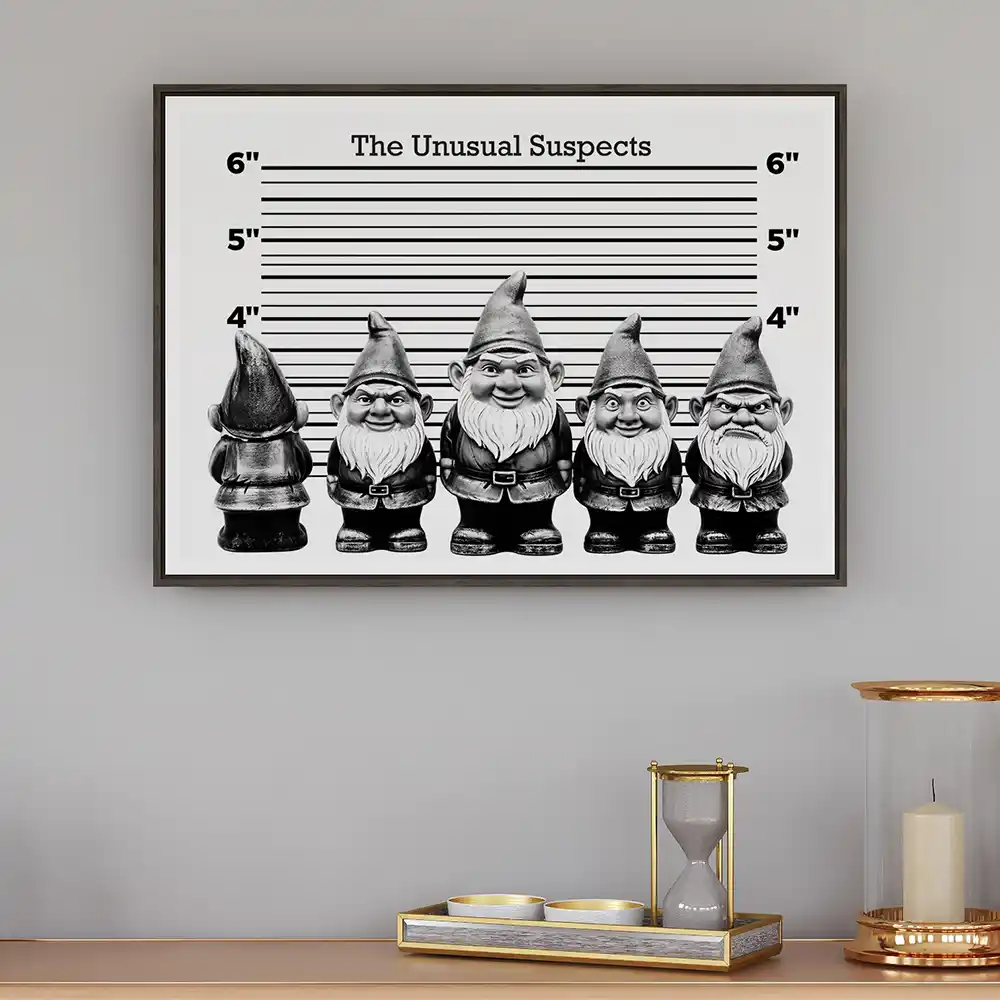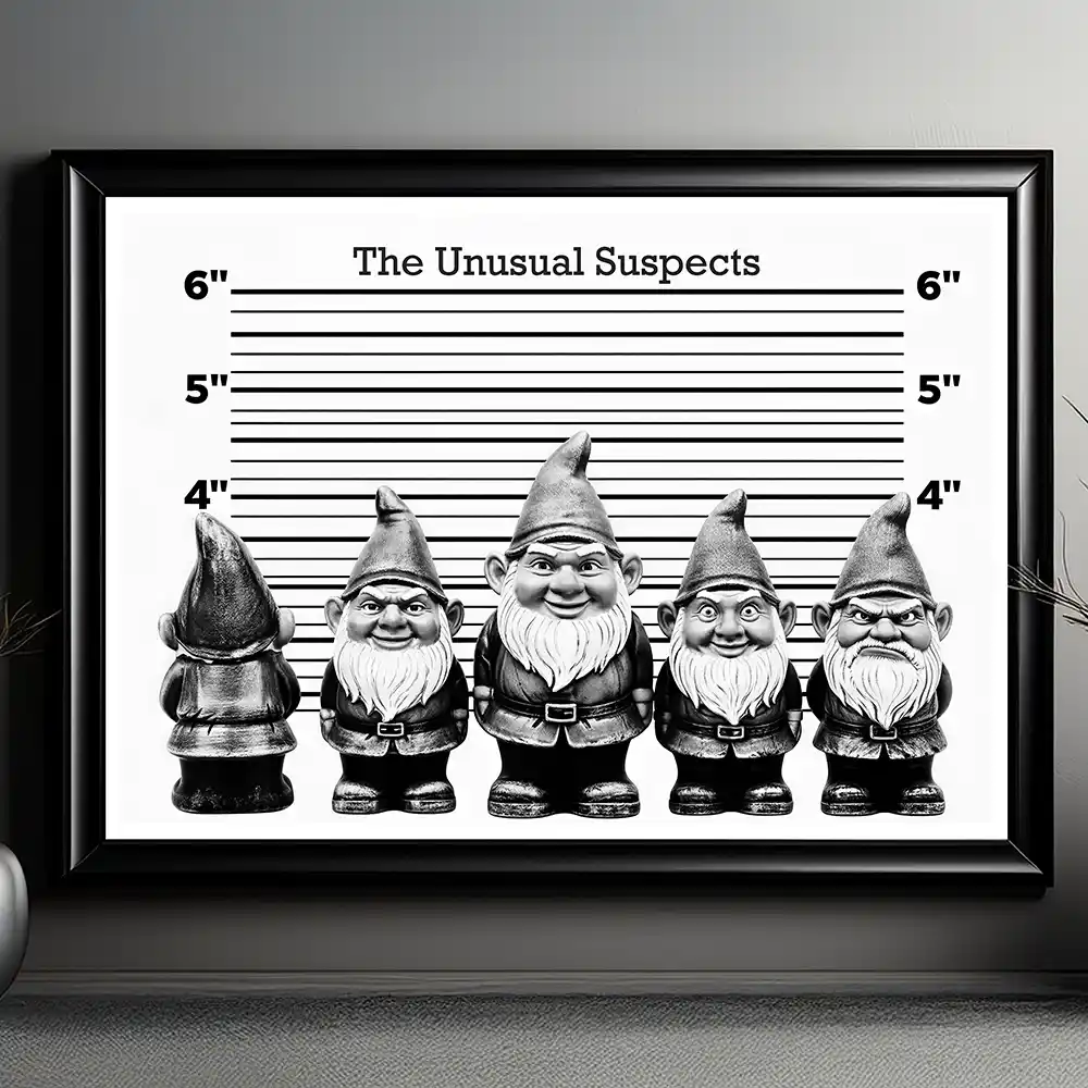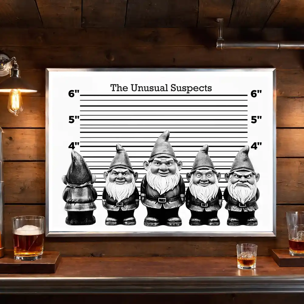 Unearth the case of the ceramic culprits with ‘The Unusual Suspects’. This cornerstone digital art print from Rex & Co.’s ‘Silver Screen Collection’ masterfully blends classic film noir tension with accessible, dry humor. Featuring a hilarious police lineup of five garden gnomes under the harsh interrogation lamp, each with expressions of shifty-eyed guilt or blatant indifference, it’s a perfect parody of iconic movie tropes. Rendered in sharp, high-contrast black and white, this typography-driven piece is a guaranteed conversation starter that proves wit is timeless.
