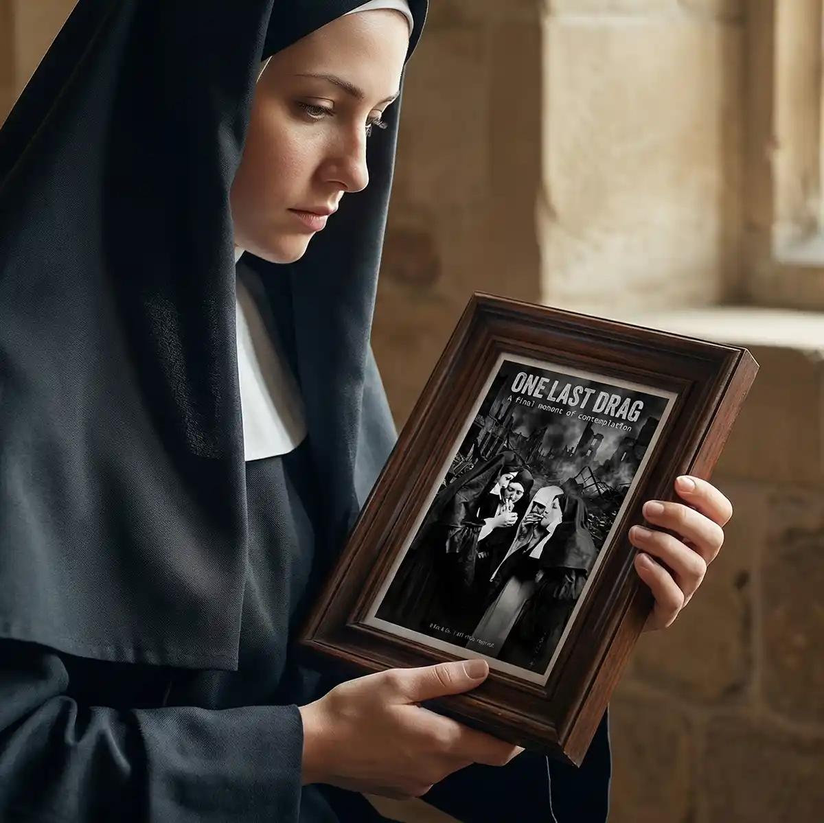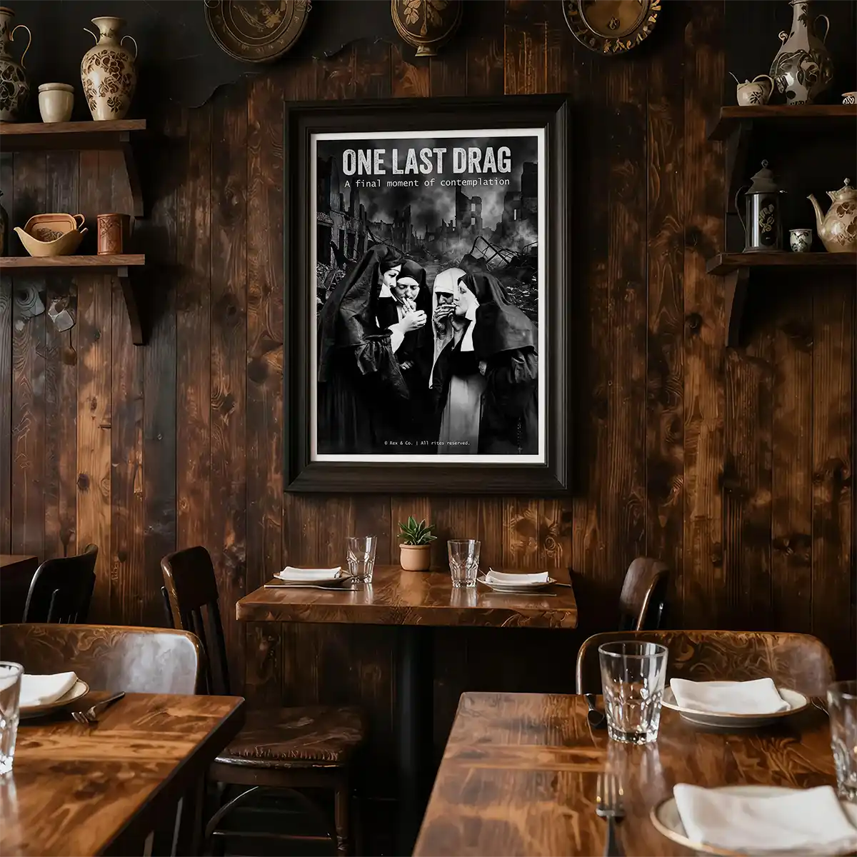 “ONE LAST DRAG” is a bold, noir-inspired digital art print that transcends mere wall decor, presenting a vision of contemplative finality where a group of nuns share a cigarette as the world ends. This downloadable masterpiece from Rex & Co. masterfully blends psychological tension, dry wit, and iconic imagery, crafted for those who seek art that challenges, amuses, and captivates.