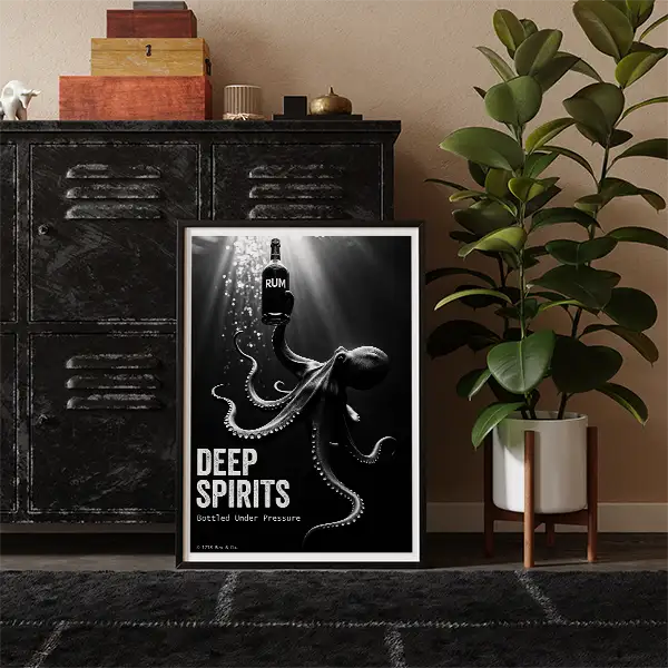Ideal for searches like “cool octopus posters”, “nautical rum art”, or “edgy black and white decor” – because some spirits refuse to stay bottled.