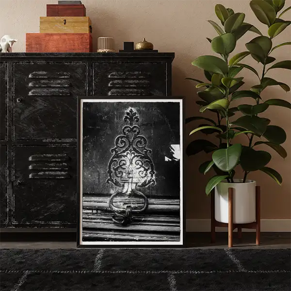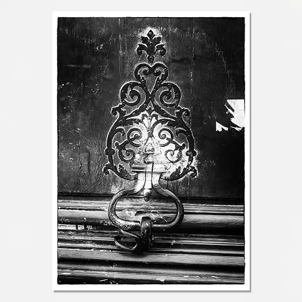 Unlock the charm of old Paris with this striking printable artwork featuring a close-up of a rustic black door knocker in dramatic film noir style. Captured by Seeress, this photograph transforms an ordinary architectural detail into a mysterious work of art, showcasing: