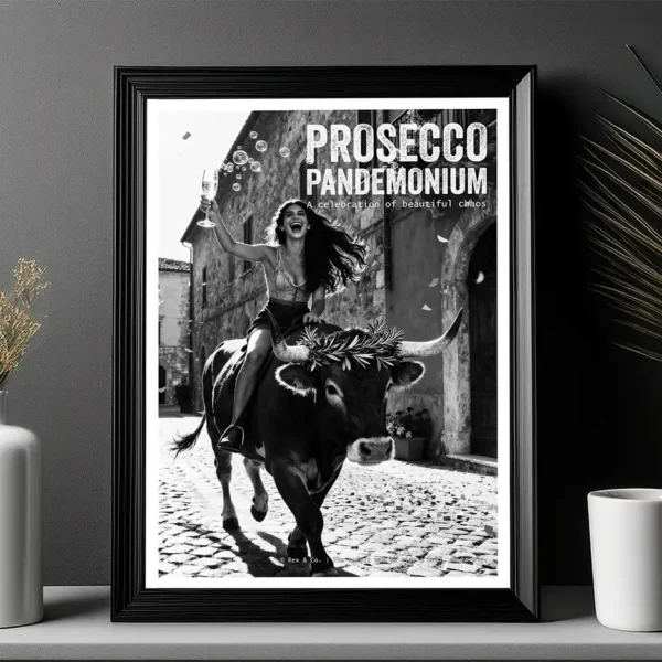 This unique digital wall art print depicts a woman riding a bull through an old Italian street, laughing as prosecco bubbles fill the air. It’s a cinematic riot of elegance and chaos, rendered in a striking style that blends classic inspiration with modern wit. This downloadable poster is for those who believe the best memories are made off the beaten path, glass held high.