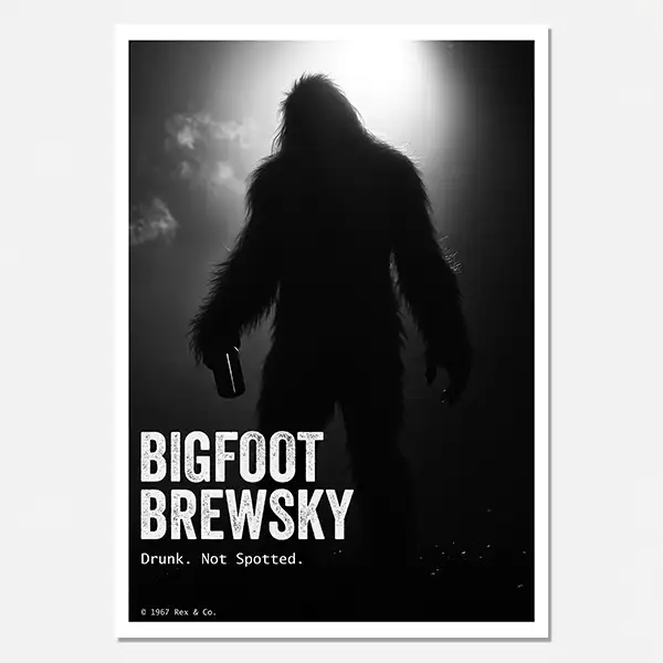 This atmospheric black and white digital poster captures Bigfoot mid-sip with a frosty “Cryptid Ale”, his silhouette barely visible through Pacific Northwest mist. Created by Rex & Co., this “Bigfoot Brewski” artwork turns blurry sightings into craft beer mythology.