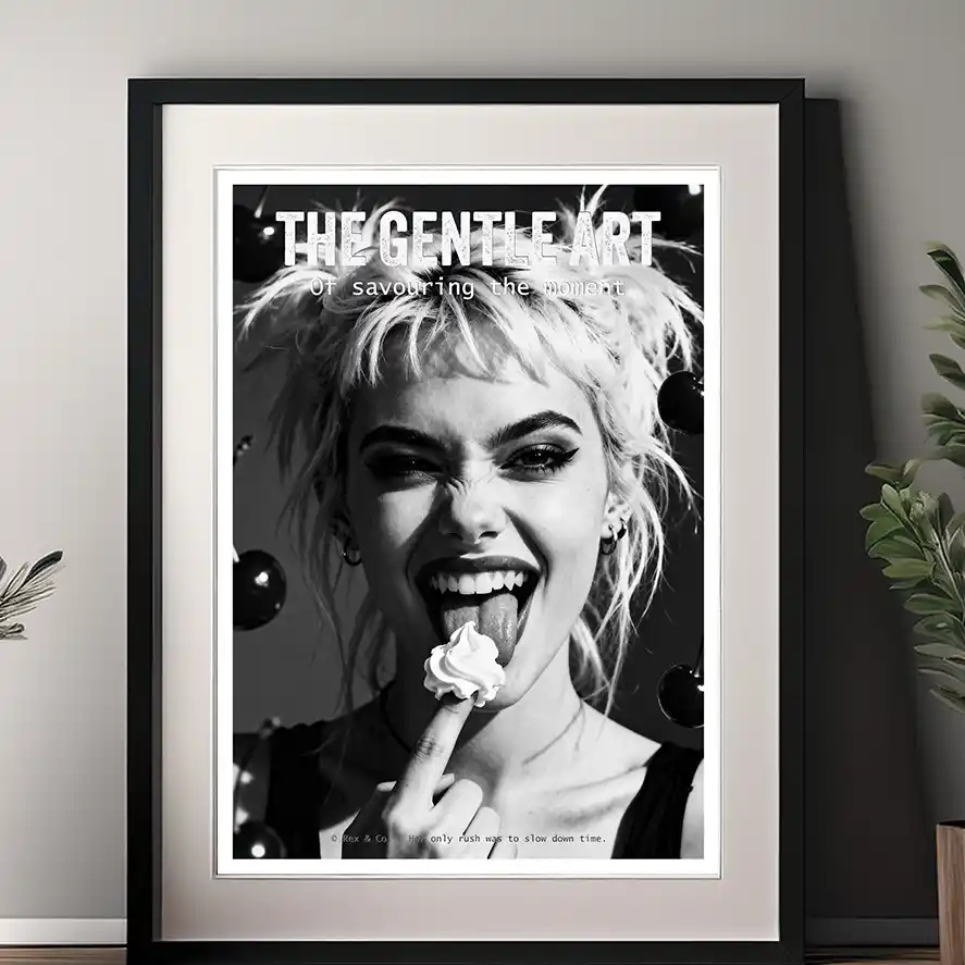 In a world that prizes speed, the true luxury is presence. THE GENTLE ART OF SAVOURING THE MOMENT is an evocative and sensual piece of printable art that serves as a beautiful antidote to the rush of modern life. This black and white print captures the pure art of indulgence—of being completely and utterly immersed in a single, perfect moment. It’s a visual ode to the senses and a core Neurodecorating prescription for the Sanctuary-Seeker, designed to cultivate a mindset of mindfulness and deep appreciation for the simple, profound pleasures of being alive.