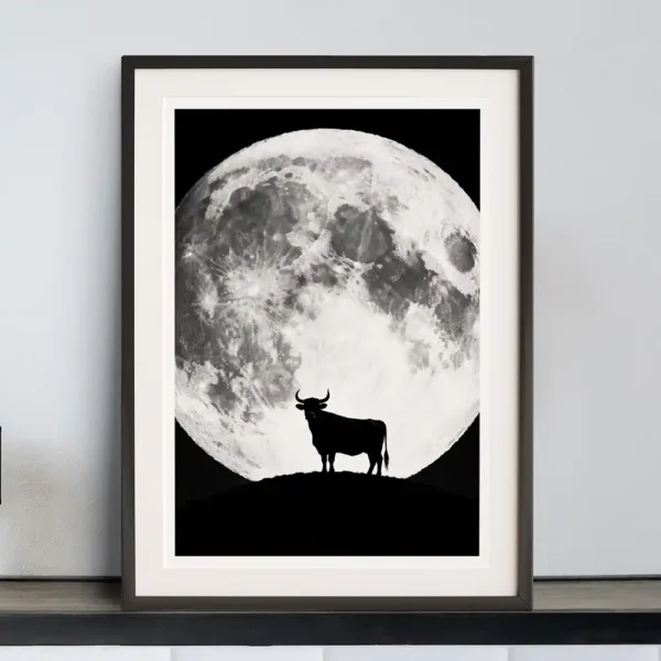 Witness the stoic monument of the Highlands. This digital art print presents the iconic Highland cow not as a mere animal, but as an ancient silhouette—a natural monument standing sentinel against the night, backlit by a colossal moon. A masterclass in negative space and mythic scale, it captures the untamed grandeur of nature where the terrestrial meets the celestial in perfect, primal harmony. Rendered in the most definitive black and white, it’s a study in endurance, solitude, and epic, timeless beauty that conveys both immense power and deep peace.