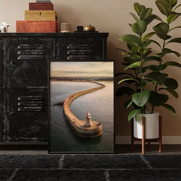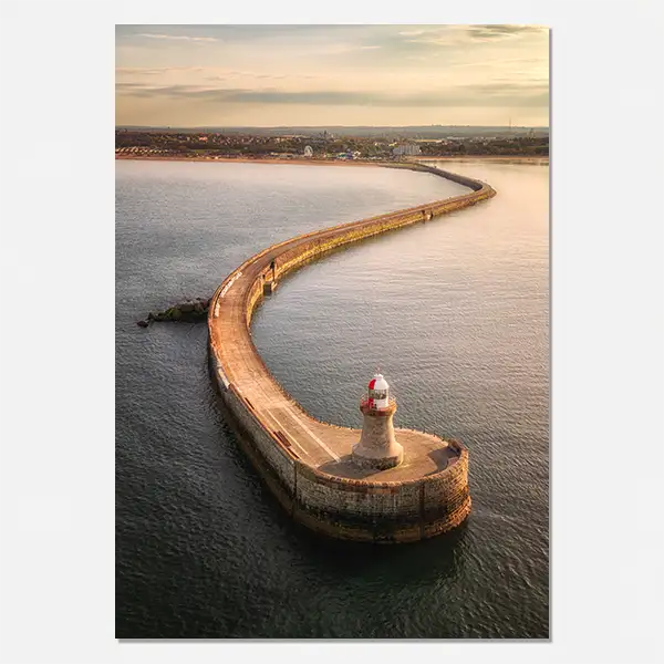 Soar above the North East coast with this stunning aerial photography print showcasing South Shields’ iconic South Pier and Lighthouse in all its glory. Captured from a unique vantage point, this artwork reveals the mesmerizing patterns of the waves against the historic stone pier, with the steadfast lighthouse standing guard at its tip.