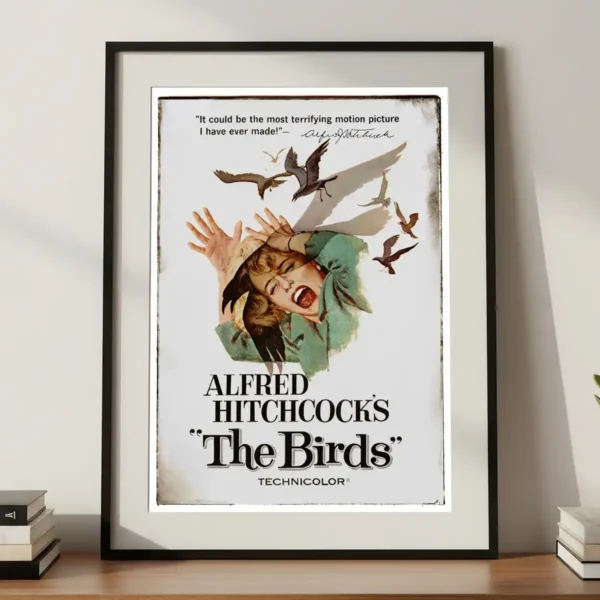 This vintage art is a digitally remastered and altered version of the original The Birds movie poster, which captures the mood and atmosphere of the film. The poster features the female character in a fearful expression covering her head to protect herself from the birds.