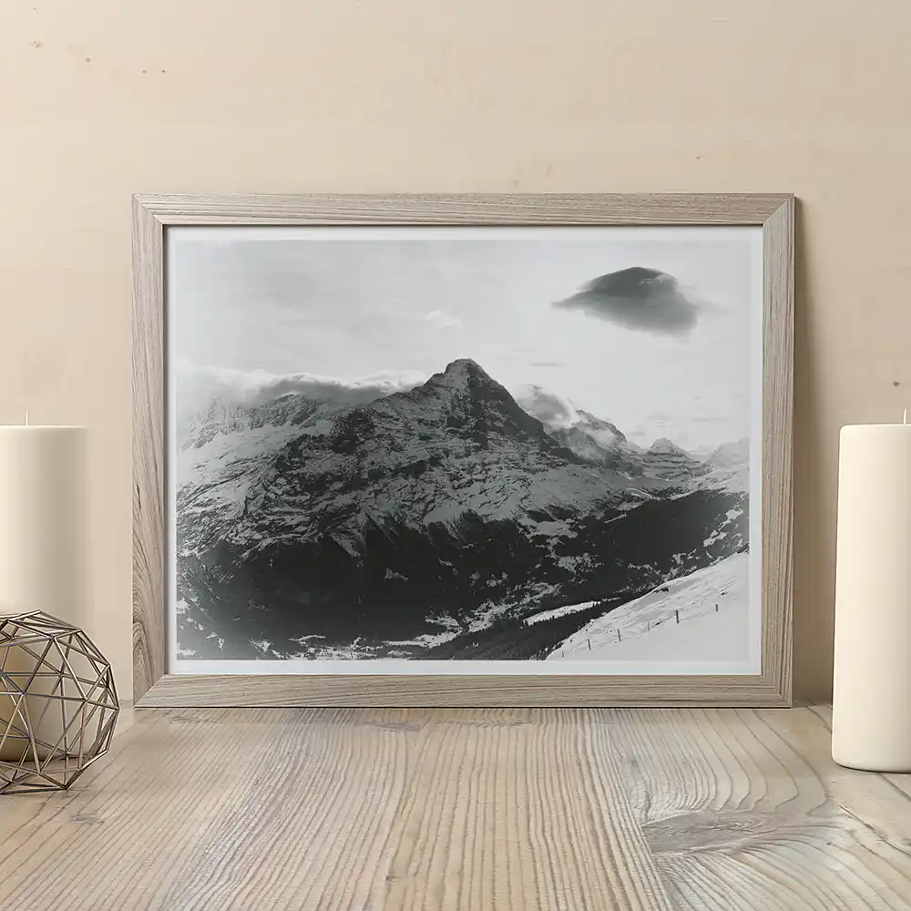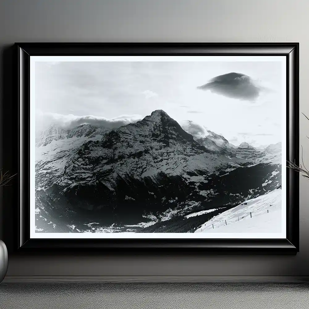 This is more than a photograph; it is a serene, expansive panorama. Captured from Grindelwald First by Mark Marsh, this landscape-orientation piece presents the iconic trio of the Eiger, Mönch, and Jungfrau across a majestic, wide-screen stage. Rendered in calming monochrome, it transforms the dramatic Alps into a harmonious and spacious vista that breathes calm.