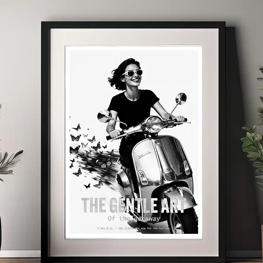 Freedom is a state of mind, and the open road is its conduit. THE GENTLE ART OF THE GETAWAY is a dynamic and joyful part of our collection, capturing the pure, unadulterated thrill of escape. This black and white print features a woman on a Vespa, a cloud of butterflies swirling in her wake—a beautiful symbol of transformation and the lightness of being that comes with answering the call of the horizon. It’s a powerful Neurodecorating prescription for the Idea-Engine, fueling a mindset of freedom, spontaneity, and the courage to choose adventure.