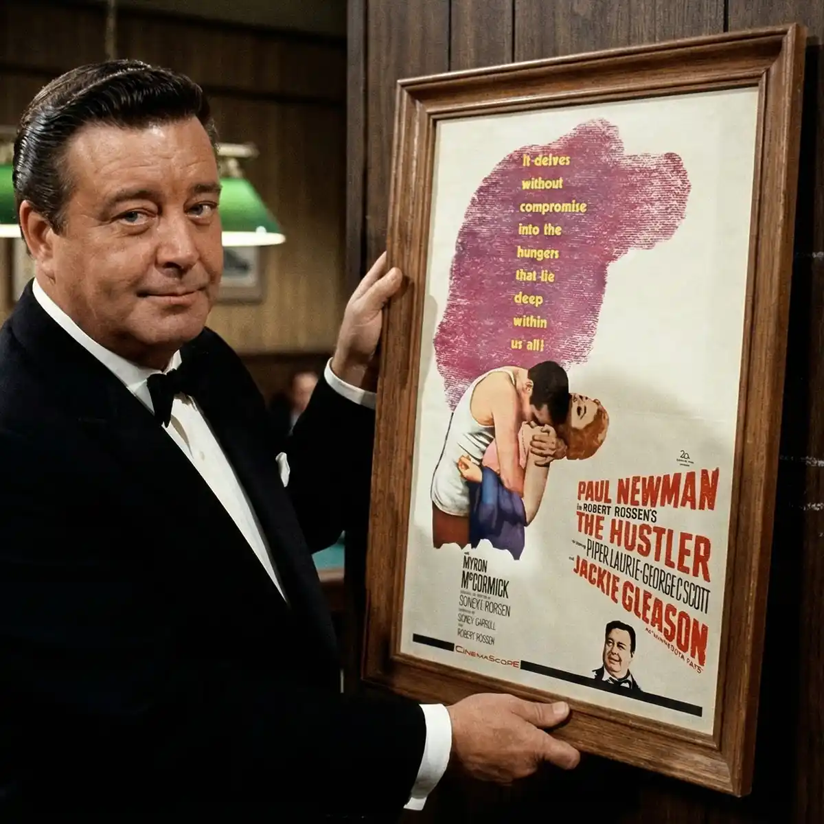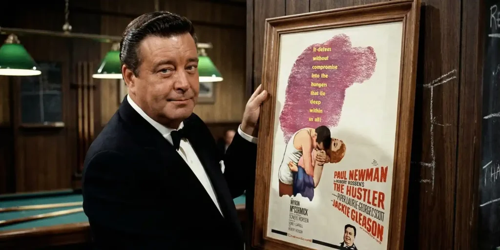 AI generated image of Jackie Gleason holding Download Artwork's digitially remastered Hustler Poster