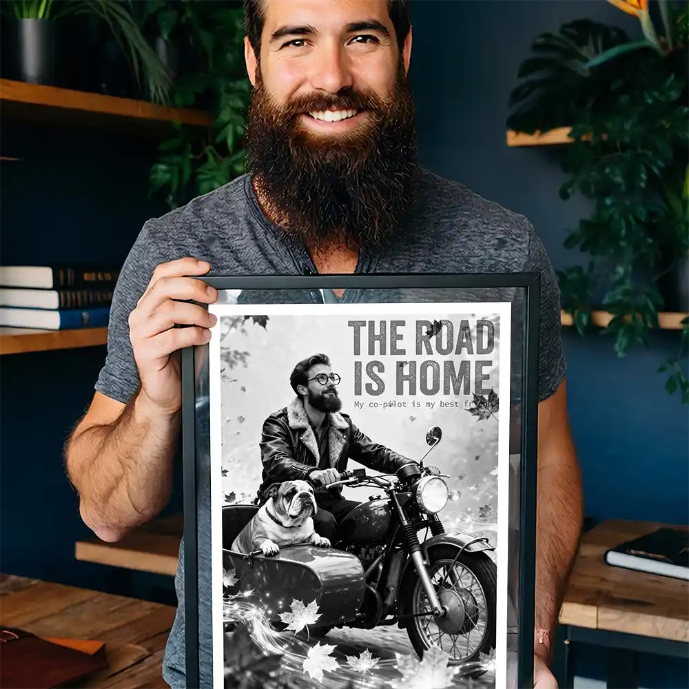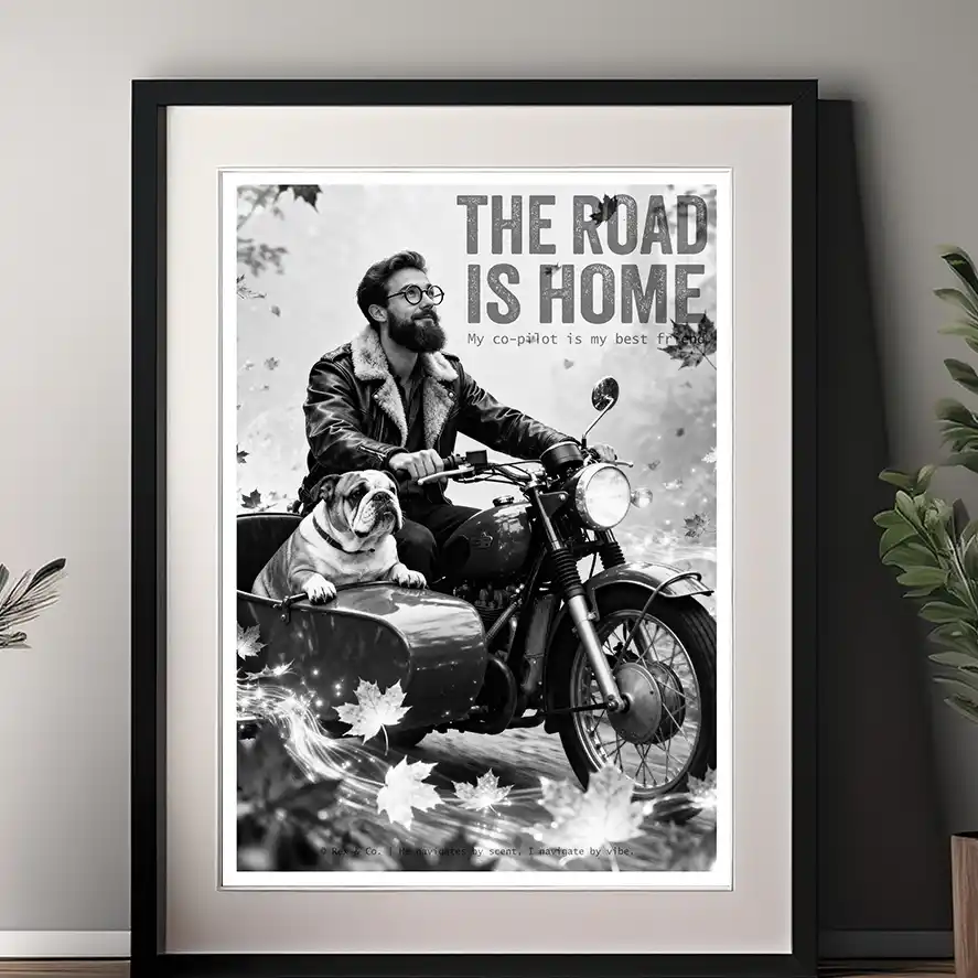 Some seek a destination, others find home on the road. THE ROAD IS HOME is an evocative and soulful piece of printable art that speaks to the wanderer in all of us. This digital download captures a moment of pure freedom—a rider and his loyal co-pilot cruising through a crisp autumn landscape. It’s a Neurodecorating prescription for the Idea-Engine who needs visual inspiration for new horizons and the Curator who builds a personal narrative of adventure and companionship.