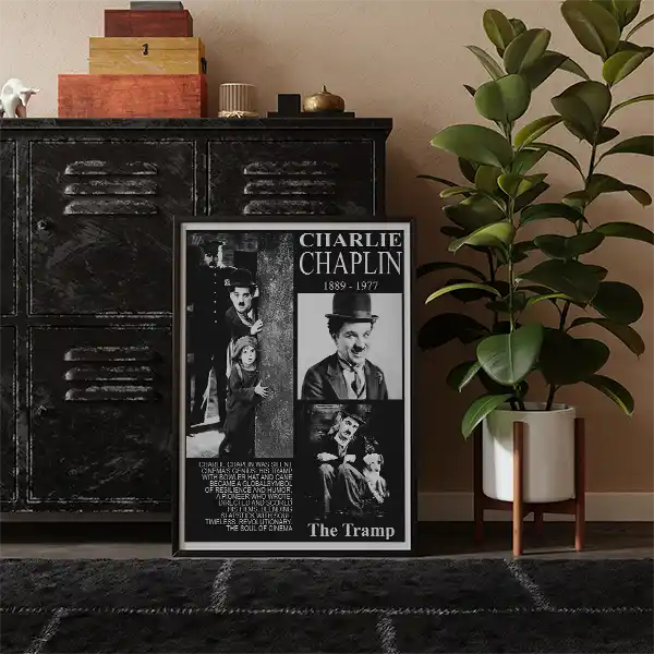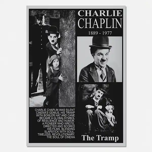 Step back into cinema history with this stunning black and white digital poster featuring Charlie Chaplin, the legendary silent film star beloved for his iconic “Tramp” character. This high-quality printable artwork showcases Chaplin in three classic poses, paired with elegant typography that highlights his enduring legacy and the words “The Tramp”—his most famous alter ego.