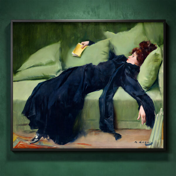 Are you looking for a statement piece to elevate your home decor? Look no further than our digitally remastered print of Ramon Casasโ exquisite After the dance print. Also know as โDecadent Young Woman After the Danceโ and “Jove Decadent”. This captivating Victorian-era painting features a young lady resting gracefully on an emerald green sofa, exuding elegance and timeless beauty – and since it is available as a digital art print you can print it as small or as large as you need.