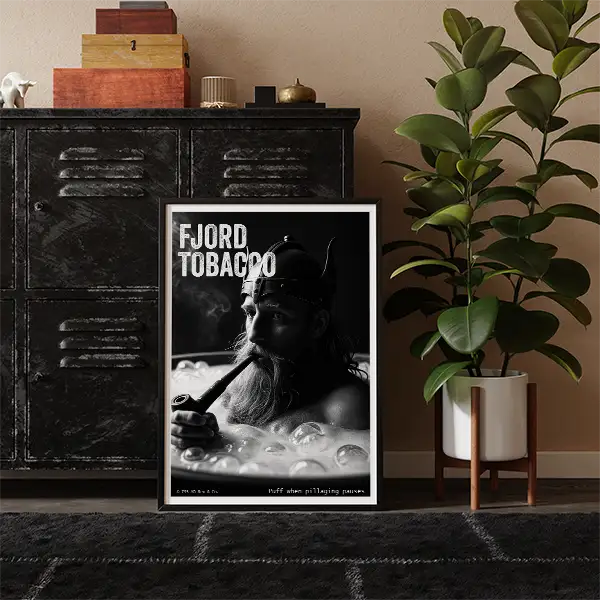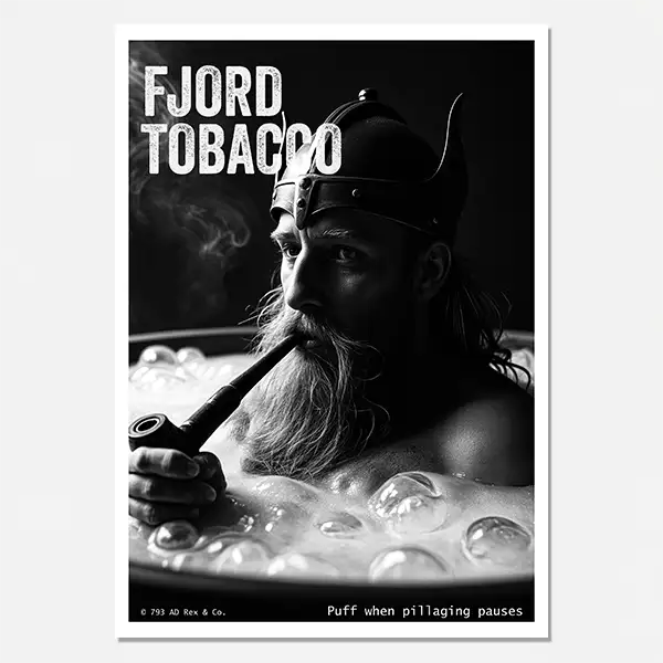 This striking black and white digital poster features a burly Viking relaxing in a wood-fired hot tub, puffing on an ornate pipe in steamy bliss. Created by Rex & Co., this “Fjord Tobacco” artwork reimagines Norse warriors with 21st-century spa-day attitude.