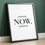 This digital art download poster is a motivational artwork that features the words Yesterday, Now, Tomorrow, with Yesterday and Tomorrow crossed out. It is a simple and elegant typographic poster that inspires you to live in the present.